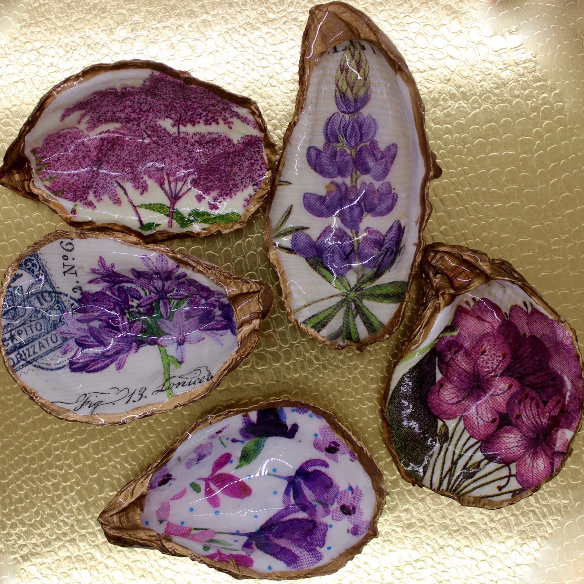 Clockwise from top: Verbena, Lupine, Large purple blossom, Dainty purple flowers with pink, Allium Precious oyster shells that have been re-purposed into beautiful handmade creations. Each shell is a true work of art and no two oysters are...Read more